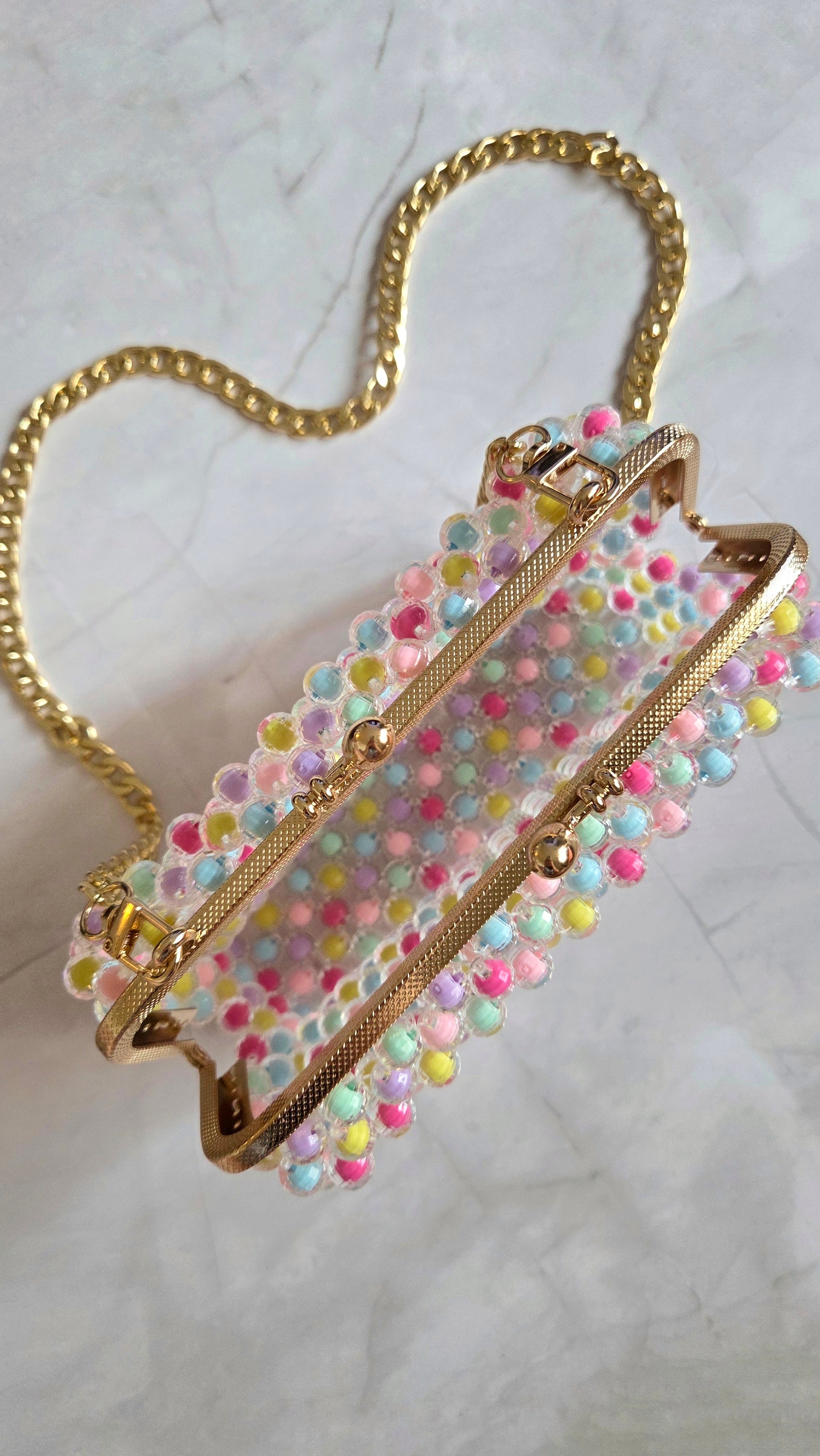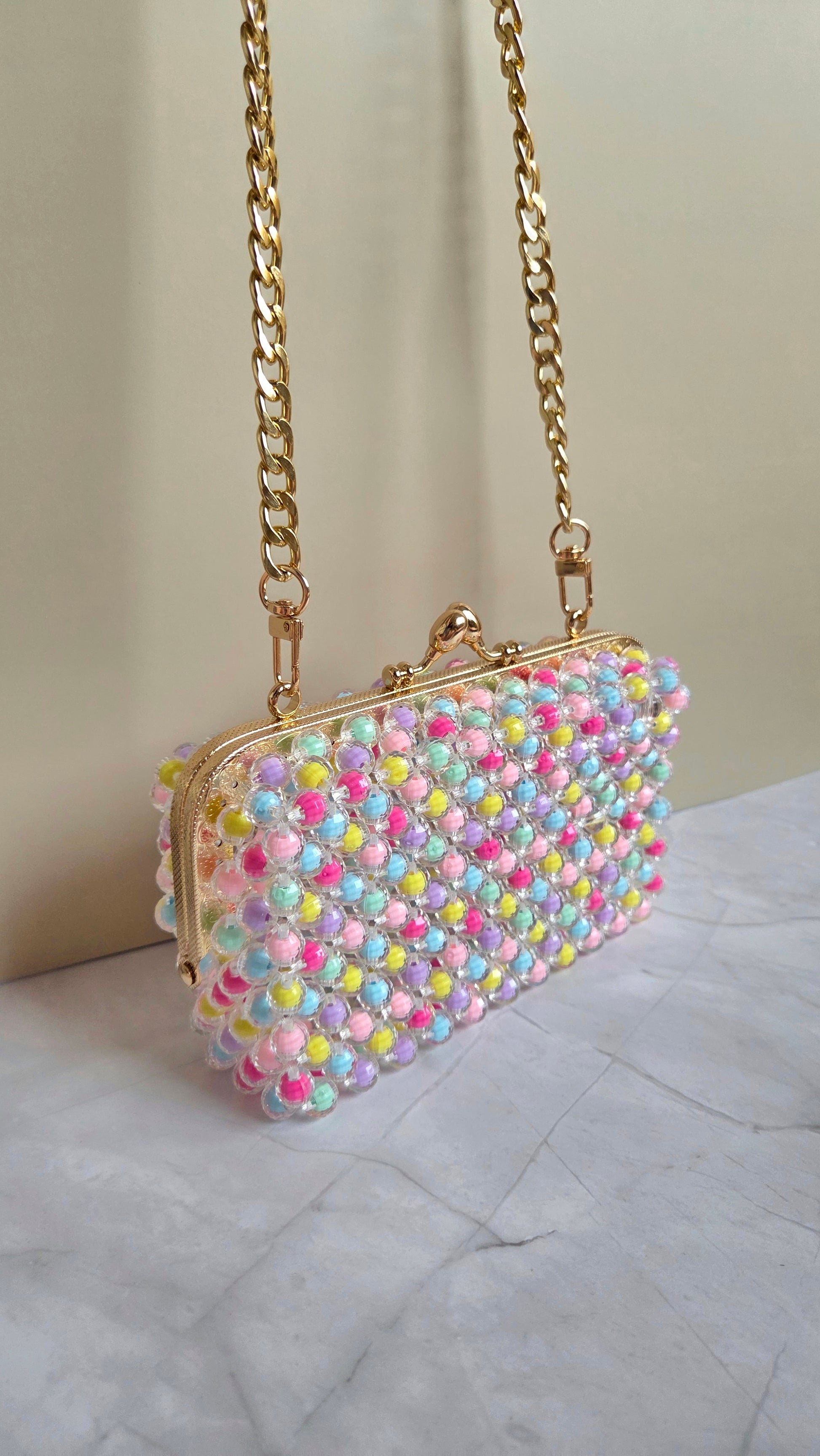 - Material: Robust metallram med färgade akrylpärlor (pärlor i rosa, gult, blått m.fl.)