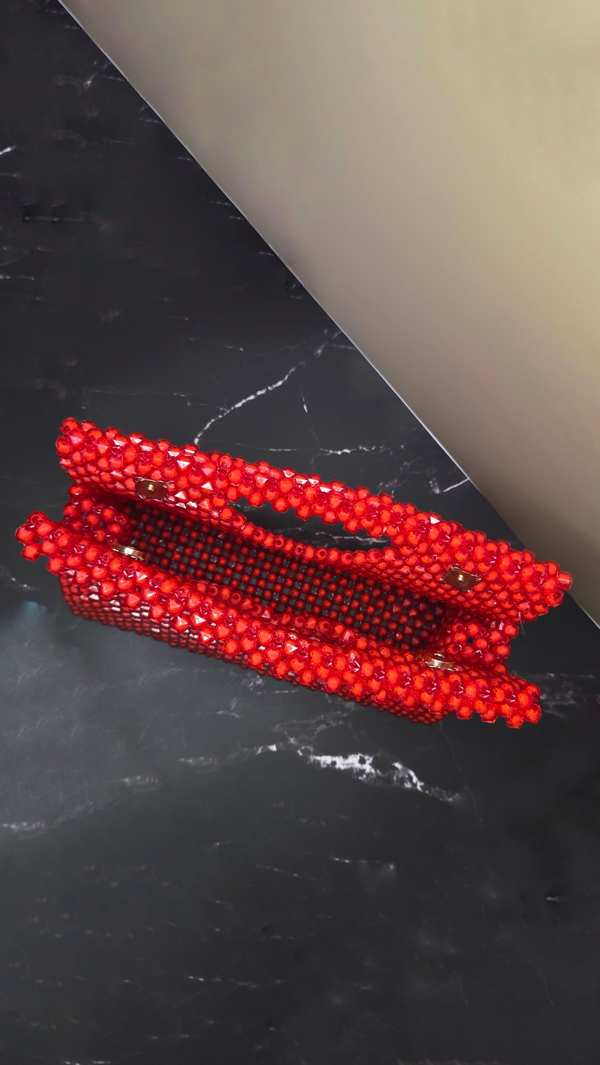 Denna medelstora, handhållna skönhet i skinande röd akrylpärla är en statement piece som gör vilken outfit som helst oförglömlig. Trots den eleganta designen är den förvånansvärt rymlig - den sväljer enkelt din mobiltelefon, nycklar, läppstift och alla dina kort. Den perfekta storleken för dig som vill ha allt nära till hands under en exklusiv middag eller en glamorös utekväll!