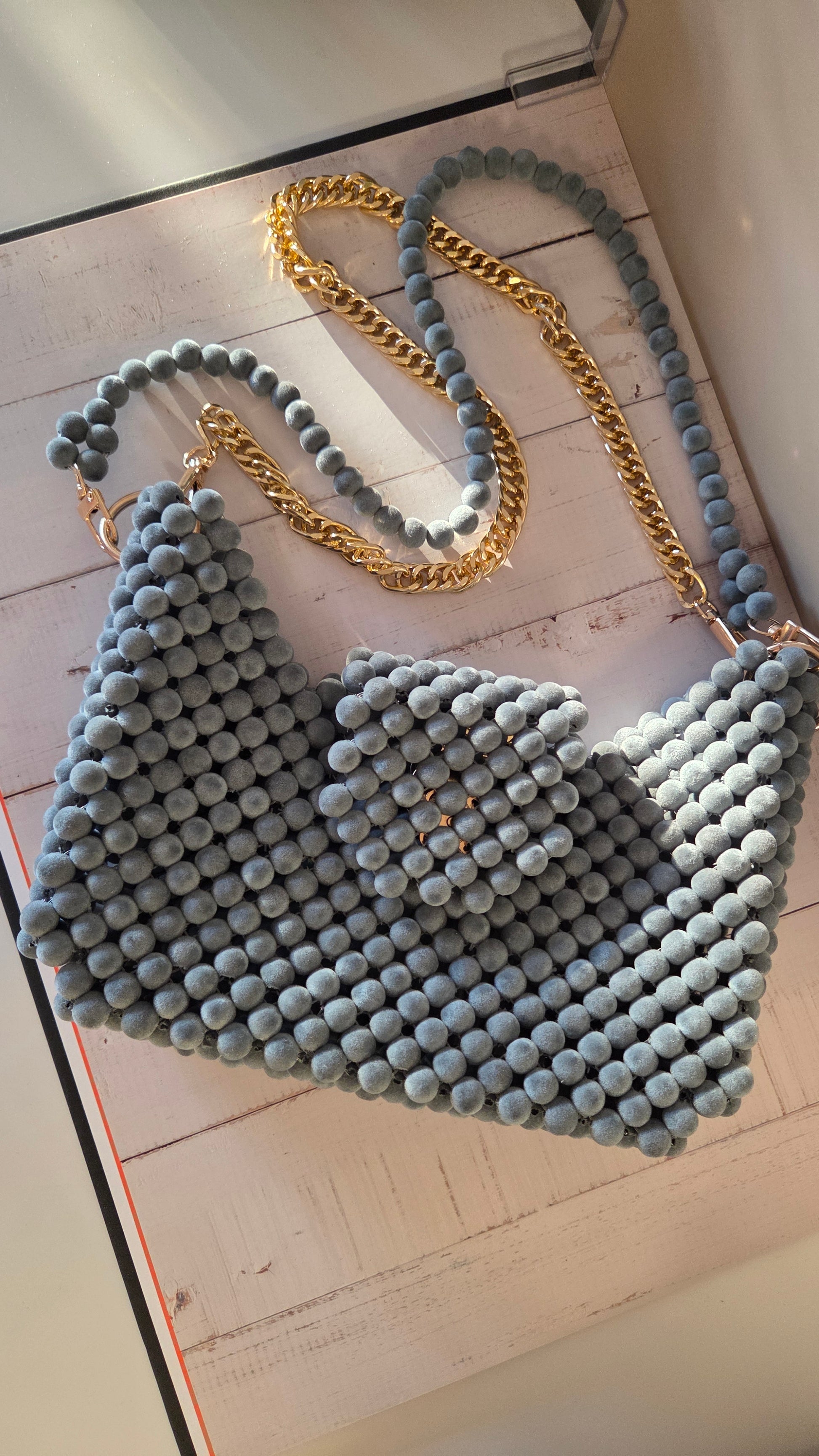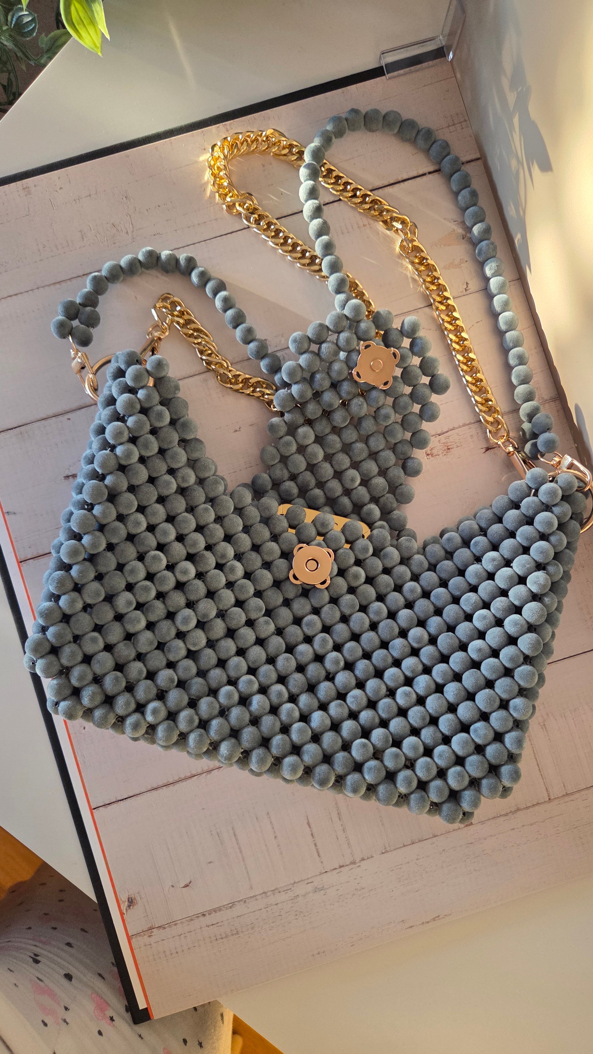 - en rem handgjord av samma pärlor för ett mjukare look en guldfärgad kedja för en mer chic och festlig stil. Bärs bekvämt över axeln och passar till både vardag och kväll.